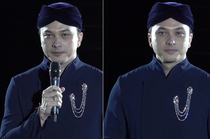 Dalam penampilannya, Nicholas Saputra tidak hanya memukau dengan pesonanya, tetapi juga dengan paduan busana tradisional dan perhiasan mewah yang begitu harmonis. Ia mengenakan atasan beskap dan blangkon berwarna navy blue yang dipadukan dengan bawahan kain batik, menciptakan tampilan klasik yang elegan dan modern. Pilihan warna dan corak batik yang tepat semakin menyempurnakan penampilannya, mencerminkan keindahan budaya Indonesia.