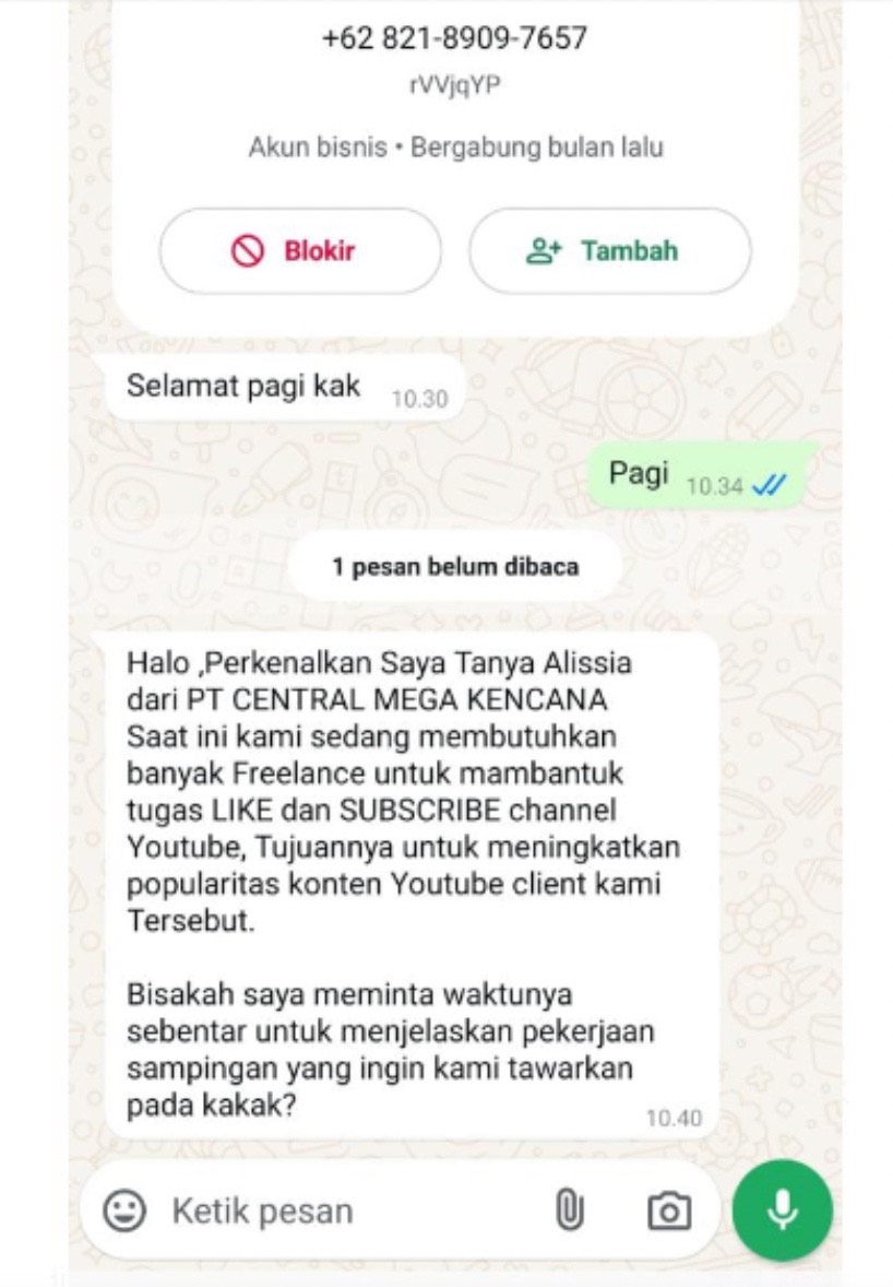Contoh pesan WhatsApp penipuan yang mengatasnamakan CMK