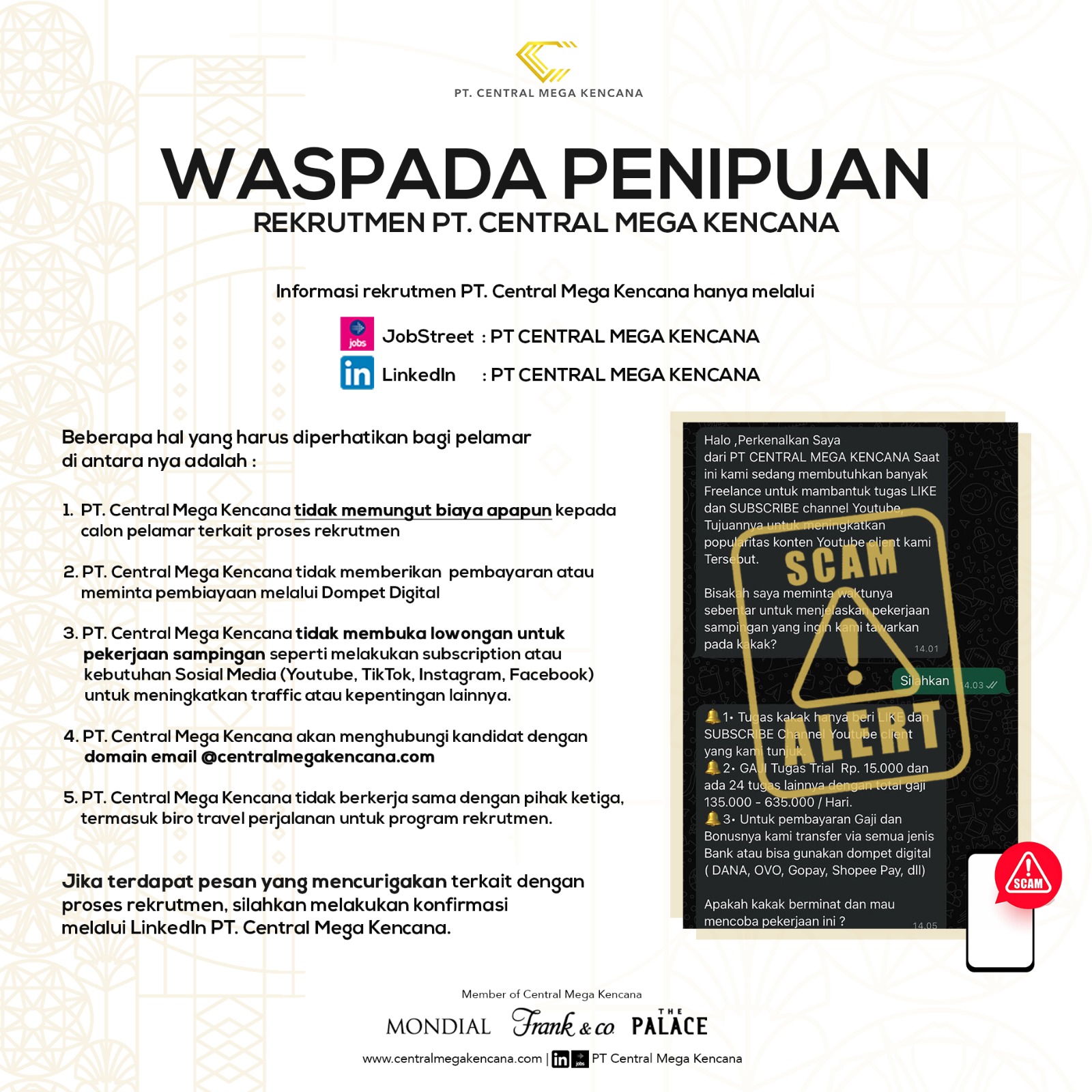 Kami juga ingin mengimbau masyarakat untuk lebih berhati-hati terhadap informasi atau ajakan yang mengatasnamakan CMK. Selalu pastikan sumber informasi yang diterima berasal dari kanal resmi CMK atau merek-merek kami (MONDIAL, Frank & co., The Palace Jeweler, dan Lakuemas).